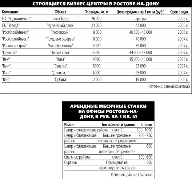 Арендные ставки в бизнес-центрах класса С, расположенных в центре и близлежащих к нему районах, составляют в среднем 800-1000 руб. за 1 кв. м в месяц, говорит Хмель. В бывших проектных институтах офисы с евроремонтом сдаются по 700-750 руб. за 1 кв. м в месяц, с менее качественной отделкой — по 600 руб. за 1 кв. м в месяц, говорит специалист по деловой аренде АН “Риэлти-центр” Алексей Руденко. Примерно такие же ставки аренды — 500-600 руб. за 1 кв. м в месяц — на офисы в спальных районах (Северный, Западный, Сельмаш), дешевле — по 300 руб. за 1 кв. м в месяц — можно арендовать помещение ближе к окраинам на производственных базах, добавляет он.