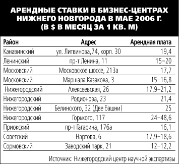 В центральной части города в аренду сейчас предлагается большое количество офисных площадей. Свободных мест с избытком в единственном в Нижнем Новгороде бизнес-центре класса А на ул. Горького, 117, строительство которого было завершено в декабре 2005 г. Есть вакантные площади в бизнес-центре на ул. Нестерова, в административном здании на Провиантской, в административно-торговом здании на ул. Короленко, в бизнес-центре “Две башни” на ул. Белинского. “Заявленная стоимость аренды в этих зданиях — от $30 до $35 за 1 кв. м в месяц, — говорит Надежда Данилова, менеджер риэлторской фирмы "Адрес". — Но нередко собственник может назначить свой курс в 33 руб. за доллар (к примеру, такие ставки на ул. Короленко). В результате реальная ставка вырастает с $30 до $36”.