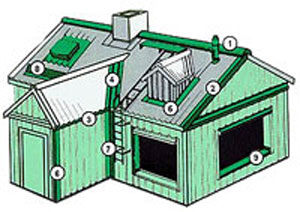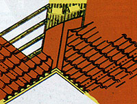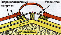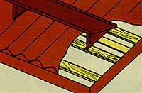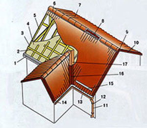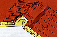 Гидроизоляционный материал (прокладку) устанавливают внахлест от карниза к коньку, при этом под коньком должен быть зазор не менее 50 мм для беспрепят-ственного испарения влаги (если чердачное помещение теплое). Обрешетка должна быть выполнена так, чтобы воздух беспрепятственно проникал от карниза под конек крыши. Вентиляционные отверстия устанавливаются в самом высоком месте кровли. Складские помещения и неотапливаемые чердаки проветриваются через торцевые окошки. В особо сырых помещениях вентиляция должна быть принудительной.