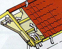 Если наклон вашей крыши больше чем 1:8, то для удобства пережвижения на крыше крепятся переходные мостики. Крепления мостика фиксируются шурупами насквозь через металлочерепицу к дополнительному основанию (не забудьте учесть этот пункт при размеке обрешетки). Расстояние между креплениями около 1000 мм.