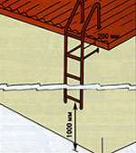 Настенные лестницы крепятся так, чтобы верхняя ступенька находилась на уровне карниза, а расстояние отземли до первой ступеньки было около 1000 мм. Между стеной и лестницей должно быть расстояние как минимум в 200 мм. Поручни лестницы фиксируются при помощи специальных креплений.