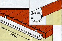 Крюки под желоб крепят так, чтобы между линией, продолжающей кровельный лист, и верхним краем желоба было расстояние хотя бы в 25 мм. Крюки крепят на расстоянии приблизительно 900 мм, но учитываются места выхода водосточной трубы стыка и концов желоба, чтобы в этих местах крюк хорошо держал констркуцию.