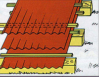 Установив и прикрепив одним шурупом первый кровельный лист у конька, второй укладывают так, чтобы нижние края составляли ровную линию. Нахлест скрепляют одним шурупом по верху волны под первой поперечной складкой. Если Вам кажется, что листы "не стыкуются", следует сначала приподнять лист, а затем, слегка наклоняя лист, двигаясь снизу вверх, укладывать складку за складкой и скреплять шурупом по верху волны под каждой поперечной складкой. Скрепите таким образом 3-4 листа между собой и получившийся ровный нижний край выровняйте строго по карнизу. И только после этого крепите листы окончательно к обрешетке.
