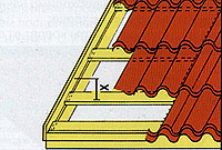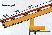Для обрешетки используются доски 25-30х100 мм. Их нужно устанавливать с определенным интервалом, в зависимости от того, с каким видом черепицы ведутся работы. У профиля типа "Монтеррей" этот интервал составляет 350 мм. При монтаже обрешетки следует не забывать, что выходящая на карниз доска должна быть на 10-15 мм толще других.