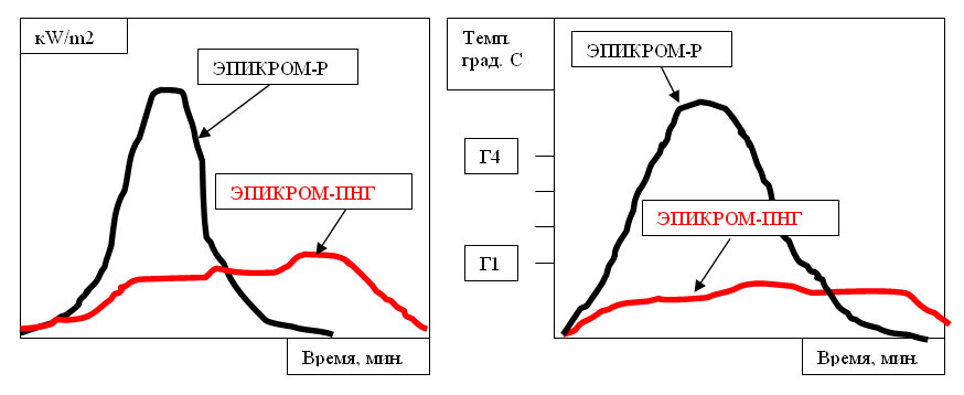 При испытании на горючесть в соответствии с ГОСТ 30244-94 поведение "ЭПИКРОМа-ПНГ", даже с группой горючести Г4, в корне отличается от рядовых эластомерных кровельных материалов. В течение 6-7 минут, из требуемых ГОСТом 10 минут огневого воздействия, "ЭПИКРОМ-ПНГ" сохраняет показатели группы горючести Г1 и, лишь при достижении в установке температуры деструкции каучука, загораются газообразные продукты распада. При сертификационных испытаниях во ВНИИПО МВД России были зафиксированы случаи, когда "ЭПИКРОМ-ПНГ" выдержал испытание и соответствовал группе горючести Г1, но обеспечить стабильность результатов испытаний нам на тот момент не удалось и материал сертифицирован на группу горючести Г4, хотя ГОСТ 30547-97 "Материалы рулонные кровельные и гидроизоляционные" для рулонных материалов толщиной менее 2 мм. показатели пожарной опасности допускает не определять. Тем не менее, результаты опытных работ, проведенных нами в последнее время позволили получить "ЭПИКПРОМ-ПНГ" с группой горючести Г1 (рис.2) (На 18.05.02 проведены сертификационные испытания во ВНИИПО, выдан сертификат на группы Г1, РП1,В2).