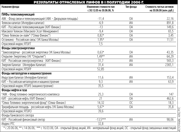 Первыми появились ПИФы, вкладывающие в компании определенной отрасли экономики. Точнее, одной из четырех базовых — нефтегазовой, энергетики, телекоммуникаций и металлургии.