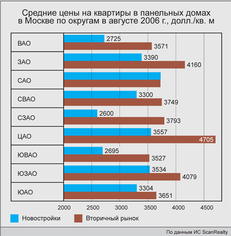 По данным мониторинга, проведенного компанией ScanRealty, на вторичном рынке больше всего квартир в панельных домах выставлено на продажу в ЮВАО и ЮЗАО — 18% от общего количества предложений, а также в ВАО и СВАО — 14,5 и 15% соответственно, а меньше всего в ЦАО и СЗАО — менее 5%. В сегменте новостроек безоговорочно лидирует восток столицы — более 30% от общего количества предложений. А вот в САО и ЦАО купить жилье в новом панельном доме проблематично: доля таких объектов в составе предложения ничтожно мала — не более 3,5%.