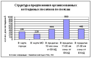 Рынок коттеджей, возведенных в зонах неорганизованной застройки, в настоящий момент переживает те же тенденции, что и рынок квартир. За семь месяцев текущего года удельная цена квадратного метра домов, находящихся в 35 километровой зоне от города, выросла почти на 25% и составляет сегодня в среднем 24838 рублей. Наиболее дорогие объекты (по 40000 за квадратный метр) расположены в 10-15 километровой зоне от ЕКАД. Причем, в отличие от рынка земли, наиболее престижными направлениями здесь, кроме Челябинского и Серовского, являются Старотагильское, Московское и Режевское.