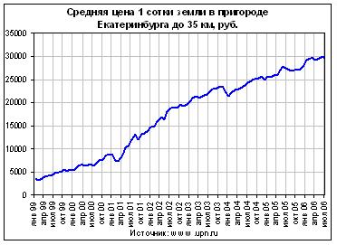 Интересно, что Рынок организованных коттеджных поселков Екатеринбурга еще только формируется, и поэтому практически нет взаимосвязи между ценой домовладения и его местоположением относительно направления и удаленности от города. Несколько иная ситуация складывается на рынке земельных участков, который также сложно назвать достаточно зрелым. Здесь в зависимости от удаленности от города, последнее время наблюдается рост популярности «среднего» пригорода – 15-20 км от города. Причем, начиная с 2004 года, четко выделилась группа «престижных» направлений – Тюменское, Челябинское и Серовское. Средний уровень цен одной сотки земельного участка, расположенного по одному из этих трактов, составляет 35000 - 42000 рублей.