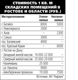 По словам старшего эксперта отдела коммерческой недвижимости АН “Нирлан” Светланы Аксеновой, арендная ставка в холодных складских помещениях зависит от месторасположения и составляет 70-150 руб. за 1 кв. м в месяц, отапливаемые площади сдаются по 140-230 руб. за 1 кв. м в месяц. Несколько выше аренда складов в центре города — 90-180 руб. и 160-300 руб. за 1 кв. м в холодных и отапливаемых помещениях соответственно. “Колебания цен зависят от степени приближенности к центральному рынку”, — объясняет Аксенова.