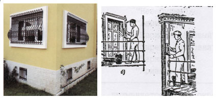 Хорошо смотрятся белые фактурные полосы из известково-песчаного раствора, имитирующие дверные и оконные наличники, а также углы фасадов. На рисунках 1 и 2 представлена натирка обрамлений по шаблону с применением известково-песчаной сухой штукатурной смеси.