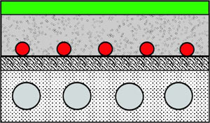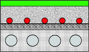 На рисунке 1 представлен разрез теплого пола, где применяется сухая смесь с большим количеством воды, необходимым для приготовления раствора, на рисунке 2 - с меньшим количеством воды. В структуре стяжки на рис.1 пузырьки воды более крупные в отличие от рис. 2, где они меньше. После испарения, поры, заполненные водой, превращаются в поры, заполненные воздухом. Соответственно, там, где воздушных пузырьков меньше и где они меньше по размеру, стяжка получается более прочной (рис. 2), и уменьшается вероятность образования трещин.