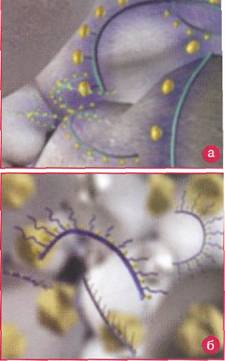 Рис.2. Схематическое изображение молекул традиционных (а) и гипер (б) суперпластификаторов