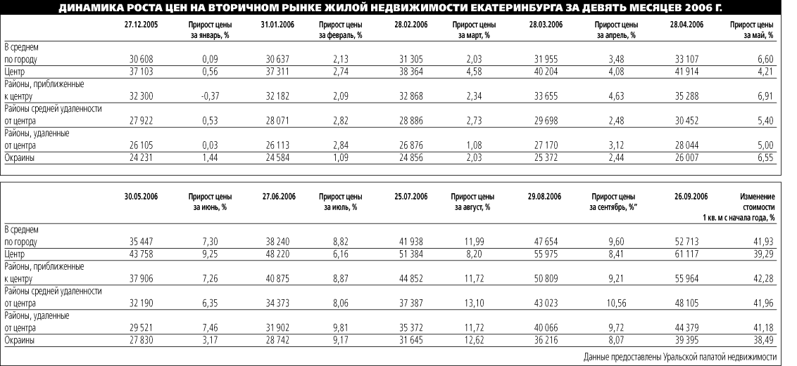 Местные аналитики ошиблись в своих прогнозах почти в два раза. С января по сентябрь цены на вторичном рынке жилой недвижимости Екатеринбурга выросли на 42% вместо обещанных 25-30% за год. По данным УПН, в январе — апреле 2006 г. темпы роста еще укладывались в прогнозируемые 2-3% в месяц, за май цены выросли на 6,6%, в августе квартиры подорожали уже на 12%.