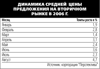 По данным “Перспективы”, в начале сентября вторичное жилье продавалось в среднем по 30 700 руб. за 1 кв. м. Подорожание к уровню июля составило почти 5%, хотя с начала года цены на вторичном рынке росли на 3-4% в месяц. По словам коммерческого директора АН “Респект” Алексея Ананьева, за январь — сентябрь квартиры на вторичном рынке подорожали примерно на 30%, итоговые темпы роста жилья за 2006 г., по его подсчетам, составят не меньше 38%.