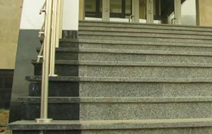 Исполнение лестницы "ковром". По центру ступени термообработанные (шершавые) 4,8м с подступенками из серого гранита "Покостовский", фриз - габбро-диабаз полированный.