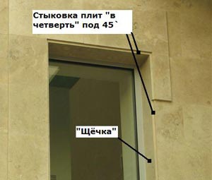 Облицовка примыкания к витражу окна доломитом "Геналдон". Добавлен элемент выступа над общей плоскостью облицовки. Примыкание сделана методом стыковки плит "в четверть". К витражу примыкает "щечка".