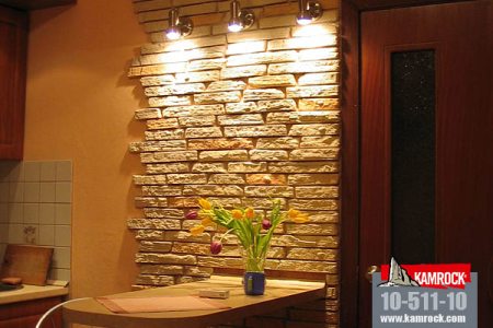 Искусственный камень великолепно смотрится рядом с самыми разными поверхностями: и деревянными, и с гладко оштукатуренными. Отделанные им кухни и лоджии из заурядных типовых помещений преображаются в яркие и неповторимые островки новой жизни. Правда, специалисты не советуют отделывать камнем стену за плитой и рабочим столами. Все-таки гладкую керамическую плитку отмыть от жира и пищевых пятен проще, чем рельефную поверхность искусственного камня. В остальном же, материал не имеет никаких ограничений.