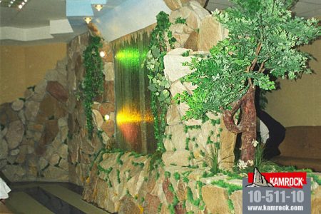 Ничто так гармонично не подчеркнет живую зелень растений, как фон из камней. Вместе с тем искусственный камень, так же как и натуральный обладает изрядной прочностью, не страшится перепадов температур и испепеляющих солнечных лучей. Тем более, что при современных строительных изысках достаточно сложно разделить интерьеры на внутренний и внешний: закрытый зимний сад летом может превратиться в открытый, на стены которого будут попадать дождь и град. Однако, облицовочный камень одинаково стоек как внутри помещения, так и на открытых участках.