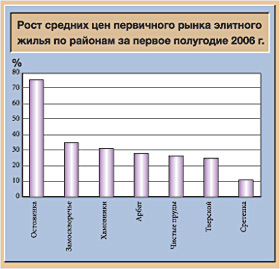 Чуть меньшие темпы роста цен продемонстрировал вторичный рынок элитной недвижимости Москвы – 27,7% за полгода. Средняя стоимость «квадрата» в первом полугодии, по данным Knight Frank, составила 12 772 долл. «В целом элитное жилье дорожает менее быстрыми темпами, чем жилье других категорий, – считает маркетолог корпорации «Инком-Недвижимость» Ирина Егорова. – По нашим данным, наибольший рост цен в сегменте элитной недвижимости отмечен в самых престижных районах: Остоженка, Арбат, Патриаршие пруды, Хамовники. На ряд объектов с начала 2006 года прирост цен превысил 40%». Эксперты единодушны: лидером по темпам роста остается Остоженка. Стоимость элитных квартир с отделкой здесь давно превысила цены на элитку в большинстве европейских столиц. В первом полугодии, по данным Knight Frank, средние цены предложения в этом районе достигли почти 22,5 тыс. долл. за метр, а максимальная дошла до 37 тыс. долл.