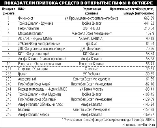 Действия крупных клиентов серьезно перекроили рэнкинг Investfunds. Аутсайдерами по сборам оказались “Альфа-Капитал” (отток 291 млн руб.) и “Пиоглобал Эссет Менеджмент” (отток 216 млн руб.). “Одна страховая компания забрала из наших фондов в октябре больше $10 млн”, — объясняет Апикян. “После того как питерский инвестбанк "КИТ Финанс" приобрел "Пиоглобал", а затем объявил о партнерстве с группой Fortis, некоторые клиенты, связанные с зарубежными экс-акционерами компании, забрали свои деньги, — признается гендиректор "Пиоглобал Эссет Менеджмент" Андрей Успенский. — Это консервативные инвесторы, болезненно реагирующие на любые перемены”. “Всегда есть клиенты, которые снимают деньги на личные нужды независимо от ситуации на рынке, поэтому ежемесячно от 1% до 3% активов выводятся клиентами из фондов, — утверждает Звездочкин. — Не думаю, что у тех управляющих, которые давно на рынке и имеют большие фонды, случилось что-то экстренное”.