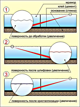 Кристаллизация - термохимический процесс между кристаллизатором и кальцийсодержащим материалом (мрамор, известняк и т.п.),позволяющий придать камню натуральный глубокий блеск (высокий коэффициент отражения света), высокую прочность и водонепроницаемость.
