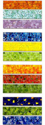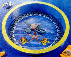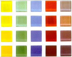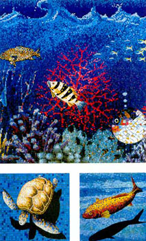 Стеклянная мозаика. Самый распространенный материал для производства мозаики сегодня - венецианское стекло. Оно долговечно, водостойко, жаростойко, морозоустойчиво и ударопрочно. Мало того, оно имеет сплошную структуру, а значит, не подвержено влиянию микроорганизмов и бактерий и может использоваться для отделки бассейнов. Что касается цветовой палитры, то ее трудно описать, настолько она многокрасочна. Для этого в процессе производства в стекло добавляют самые разнообразные добавки: от бора, кадмия и селена до полудрагоценного минерала авантюрин и перламутра.