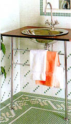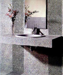 Нетрадиционные материалы. Один из них - керамогранит, с удовольствием используемый в оформлении интерьеров. Керамогранит прочнее, чем просто керамика, и обходится гораздо дешевле, чем привозные материалы. Но если технология его изготовления соблюдалась не в полном объеме, со временем он начинает расслаиваться и терять цвет. Для мозаики используется и так называемый Metron - смесь кусочков авантюрина и разноцветного стекла, скрепленных специальным составом - легким, но очень прочным, водостойким, жаропрочным, устойчивым к перепадам температур. Metron прекрасно подходит для облицовки стен и полов, из него делаются столешницы, подоконники, плинтусы.