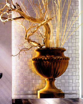 Металлическая мозаика появилась лишь несколько лет назад. Модули представляют собой штампованные металлические колпачки высотой 4 мм из полумиллиметрового листа нержавеющей стали. Они закрепляются на запатентованной резиновой подложке, которая придает плитке необходимую степень жесткости. Модули могут иметь разную форму, фактуру и даже цвет поверхности. Овальные, шестигранные, прямоугольные, ромбовидные и квадратные элементы позволяют выложить замысловатый ковер на стене или на полу. Поверхность стали делают полированной, матовой, с насечками разных видов и, наконец, покрытой тонким слоем латуни или бронзы.
