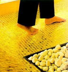Чаще всего золотую мозаику используют поштучно, делая вставки. Подобные изделия предлагаются как для стен, так и для полов, вкрапления особенно красиво смотрятся на дне бассейна.