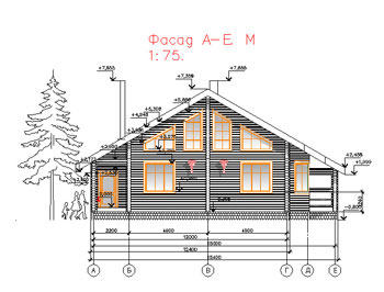 Чертежи фасадов представляют собой проекции наружного вида дома на вертикальную плоскость. Различают главный (лицевой), боковые и задний фасады. На чертеже указываются окна, двери, козырьки, цокольная часть стен, карнизы, слуховые окна, конфигурация крыши, балконы, лоджии.