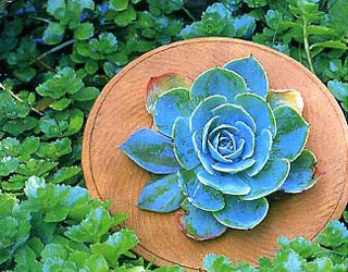 Розетка молодила, обрамленная широкими полями шляпы-горшка, выглядит очень симпатично среди зелени очитка.