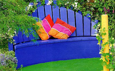 Как вам нравится эта необычная скамейка в форме полумесяца? Нестандартный вариант, в общественном парке такую не встретишь. Здесь, укрывшись пледом, с мягкими подушками под боком, можно с удовольствием проводить тихие вечера: наблюдать звезды, вдыхать ночные ароматы, кормить комаров... Такую скамью не так уж сложно смастерить своими руками, в крайнем случае, заказать. И уж совсем просто покрасить ее водостойкой краской в свой любимый цвет и подобрать пару подходящих аксессуаров.