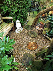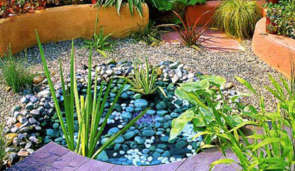 Прекрасный способ "облагородить" садовую низинку - взять ее в обрамление из каменных стенок и тем самым превратить в подобие комнаты под открытым небом. "Пол" в этом уединенном оазисе лучше покрыть слоем гравия, а вместо клумбы, чтобы не таскать сюда землю, сделать пруд. Дно водоема выкладывают пленкой, края которой придавливают речными валунами. Дополнительным украшением послужат деревянные мостки, повторяющие форму прудика, и влаголюбивые растения. Для пущей красоты можно положить в воду покрашенные разноцветной краской камни, а в особо торжественных случаях - так и вообще, добавить туда пищевой краситель.