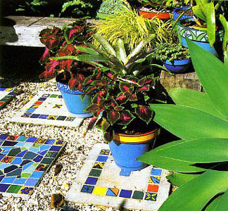 Плитка сочных тонов создает атмосферу экзотики даже на самом маленьком пространстве. На ее фоне отлично выглядят такие цветы в горшках, как крапивка.