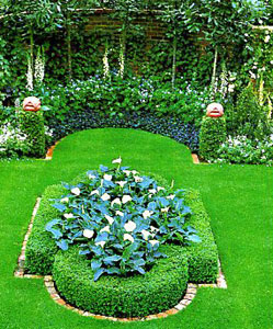 Такие цветники всегда оказываются в саду в центре внимания. И это хороший повод дать волю своей творческой фантазии. Один из вариантов предлагают английские ландшафтные специалисты. Сначала определите для себя форму новой клумбы и посадите, как здесь, кулису из самшита (пять-шесть кустов на каждый метр). Контуры клумбы подчеркните бордюром из камня. Особенно изысканно выглядят небольшие клумбы, засаженные одной культурой. На этой солирует белоцветковая калла, или зантедешия эфиопская (Zantedeschia aethiopica), которая комфортно чувствует себя в условиях мягкого британского климата. Для наших температур неплохой альтернативой ей может стать, например, крупнолистная функия.