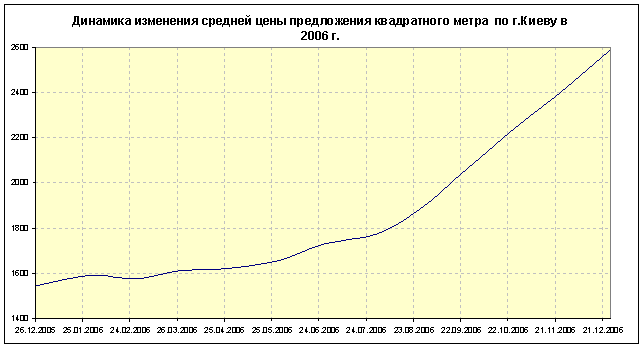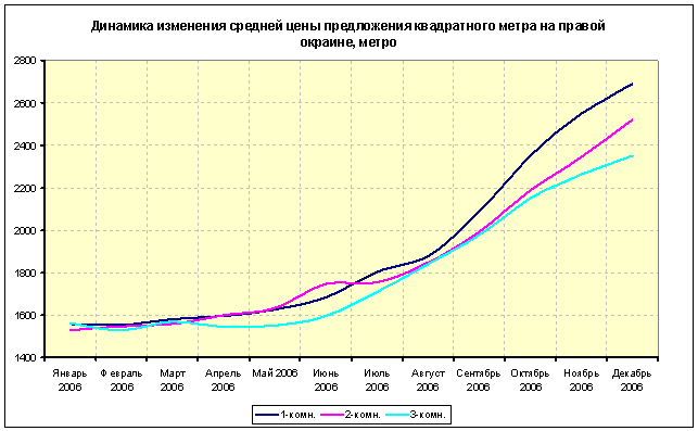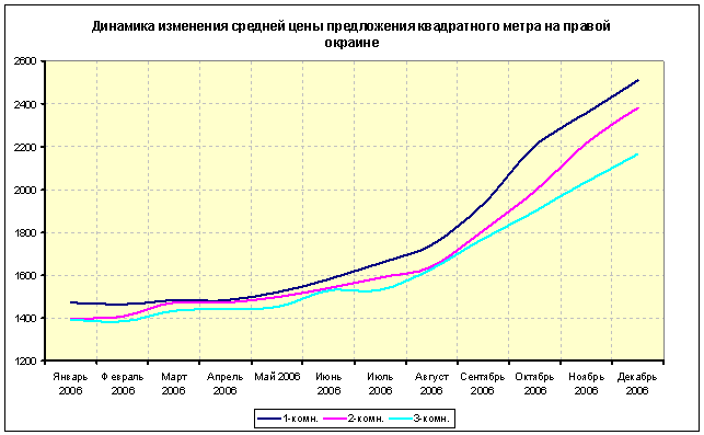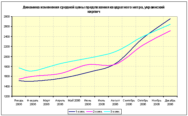 Усредненный квадратный метр в сегменте рынка «украинский кирпич» за 2006 год подорожал на 68,0%. Максимальные темпы роста были зафиксированы на однокомнатные квартиры – за 2006 год цена квадратного метра выросла на 92%.