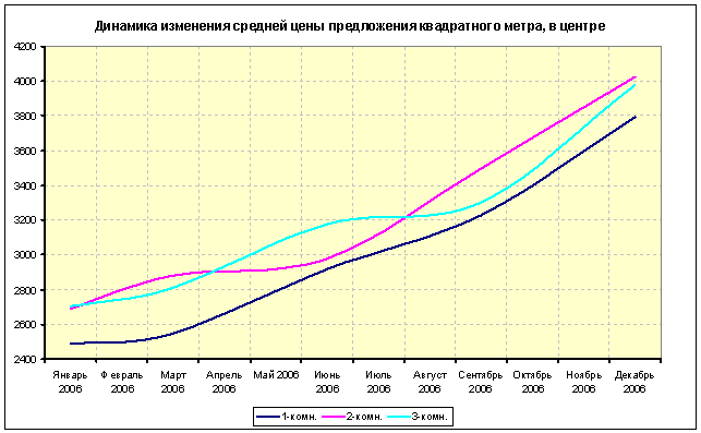 Усредненный квадратный метр в центре подорожал за 2006 год на 57,4%. Наибольший темп роста (+65,4%) был на двухкомнатные квартиры, наименьший (+51,5%) - на трехкомнатные.