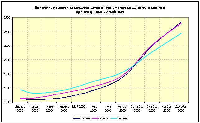 Усредненный квадратный метр в прицентралье подорожал за 2006 год на 63,2%. Максимальный темп роста (+67,2%) был на двухкомнатные квартиры; минимальный (+54,4%) на трехкомнатные.