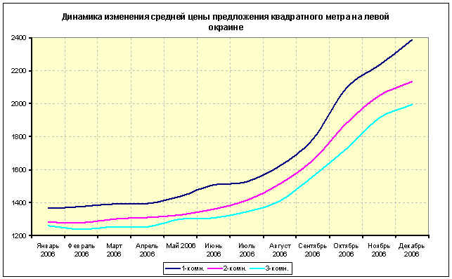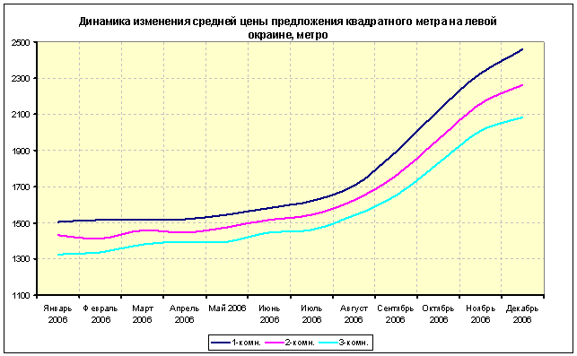 Усредненный квадратный метр на левобережной окраине возле метро подорожал за 2006 год на 58,5%. Максимальный темп роста (+65,4%) был на однокомнатные квартиры; минимальный (+56,7%) на четырехкомнатные.