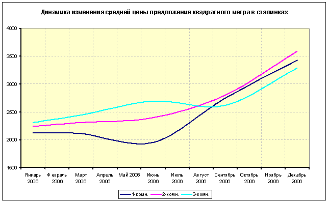 Усредненный квадратный метр в «сталинке» за 2006 год подорожал на 58,8%. При этом, больше всего подорожали двухкомнатные (+75,3%), а меньше всего – трехкомнатные (+50,0%).