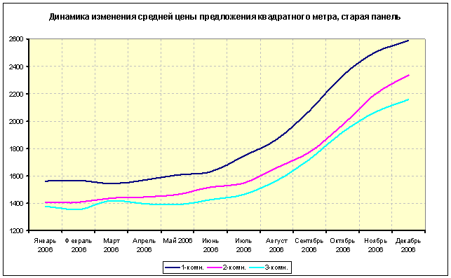 Усредненный квадратный метр в сегменте рынка «старая панель» за 2006 год подорожал на 64,2%. Максимальная цена квадратного метра была в однокомнатных. Максимальный прирост (+69,3%) зафиксирован на двухкомнатные квартиры, минимальный прирост (+61,3%) - на трехкомнатные.