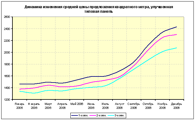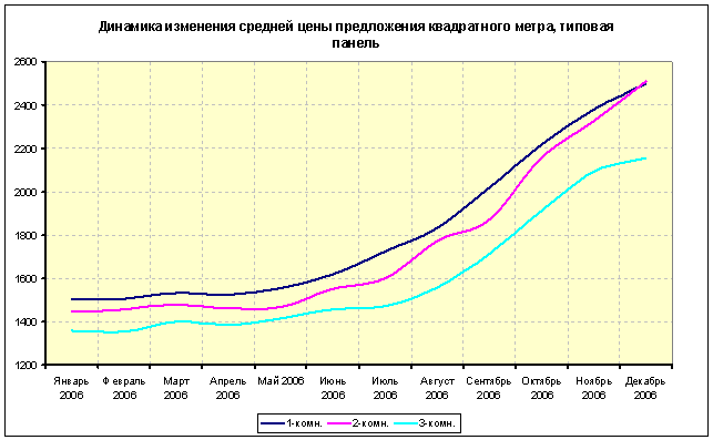Усредненный квадратный метр в сегменте рынка «типовая панель» за 2006 год подорожал на 66,5%. Минимальная цена и минимальный прирост (+60,2%) зафиксированы на трехкомнатные квартиры. Максимальный прирост (+73,2%) был на двухкомнатные, которые по стоимости квадратного метра сравнялись к концу года с однокомнатными.