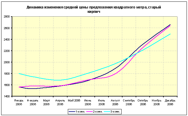 Усредненный квадратный метр в сегменте рынка «старый кирпич» за 2006 год подорожал на 69,2%. При этом, если год назад, квадратный метр в трехкомнатной квартире стоил дороже чем в однокомнатной, то к концу 2006 года это соотношение изменилось. Темпы удорожания квадратного метра в однокомнатных и двухкомнатных были примерно одинаковы и составили 72-73% за 2006 год.