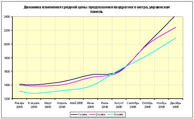 Усредненный квадратный метр в сегменте рынка «украинская панель» за 2006 год подорожал на 66,1%. При этом более всего подорожал квадратный метр в однокомнатных квартирах (+73,7%).