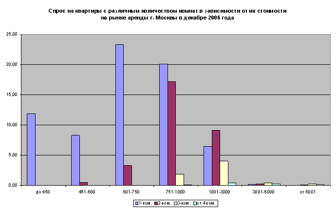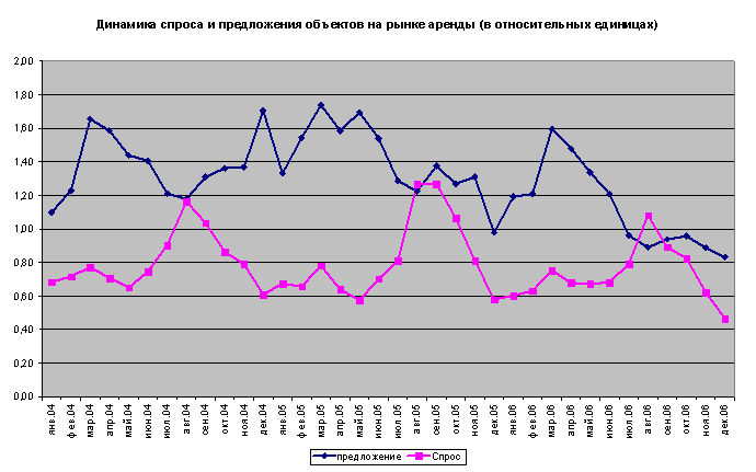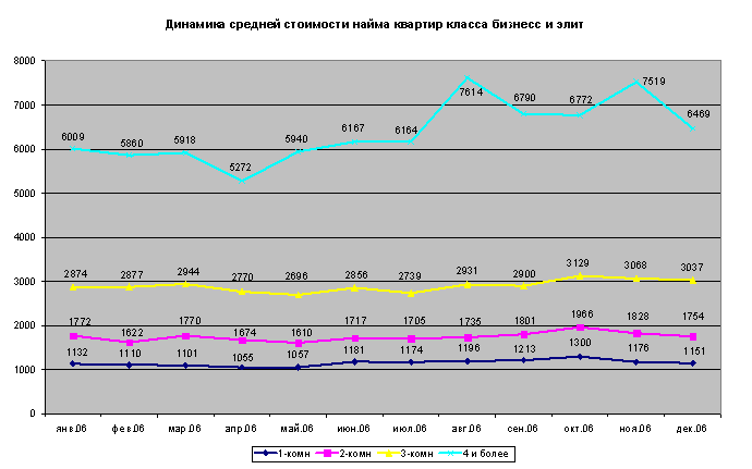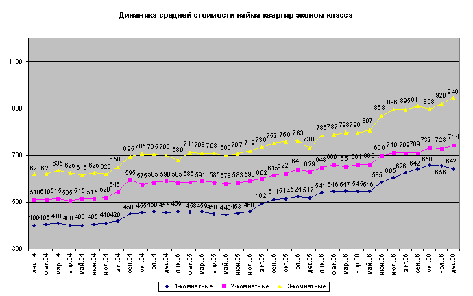По итогам всего 2006 года средняя стоимость найма квартир эконом-класса увеличилась для 1-комнатных квартир – на 18,67% (или на $101), для 2-комнатных – на 14,81% (или на $96) и для 3-комнатных – на 20,5% (или на $161).