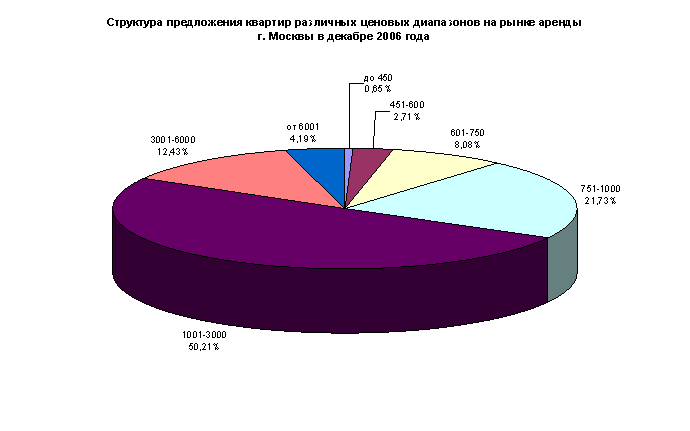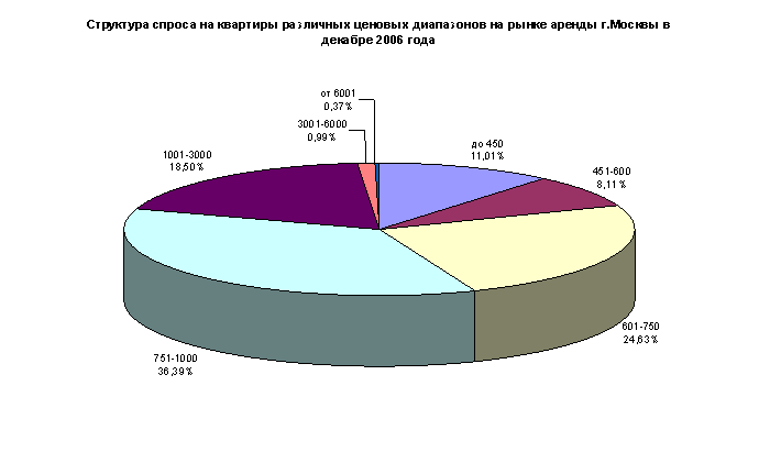 По-прежнему наибольшим спросом пользуются квартиры, находящиеся в ценовом диапазоне $ 751-1000 в месяц (36,39%). Вслед за ними идут квартиры по цене $601-750 (24,63%). Предложение же в этих категориях по-прежнему значительно (в несколько раз) ниже спроса. Замыкают тройку лидеров объекты с арендной ставкой в $ 1001-3000 в месяц (18,5%). Достаточно велика в структуре спроса доля квартир по цене до $ 450, которых на рынке практически не осталось (0,65% всего предложения).