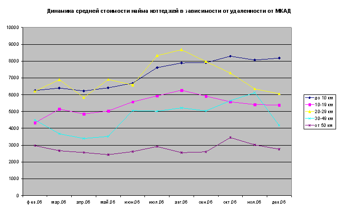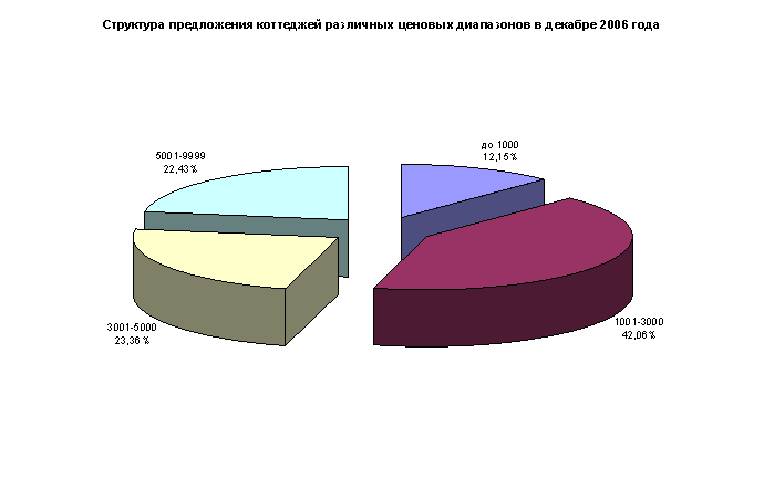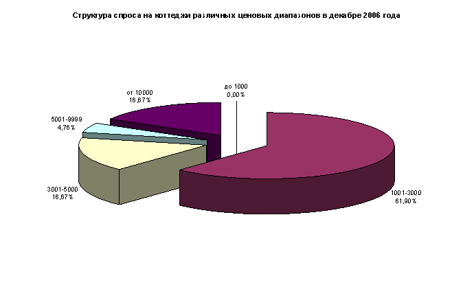 На рынке аренды загородной недвижимости ситуация прямо противоположна столичному: здесь предложение превышает спрос практически во всех ценовых категориях. Самыми востребованными в декабре 2006 года остаются коттеджи стоимостью найма от $1000-3000, причем спрос на дома этой ценовой категории продолжает расти уже второй месяц: по сравнению с ноябрем этот показатель вырос на 8,05%. (61,9% в декабре против 53,85% в ноябре). Далее следуют коттеджи с арендными ставками в размере $ 3001-9999 и от $ 10 000 в месяц (16,67%). Коттеджи в ценовой категории до $ 1000 в декабре вовсе исчезли из структуры спроса.