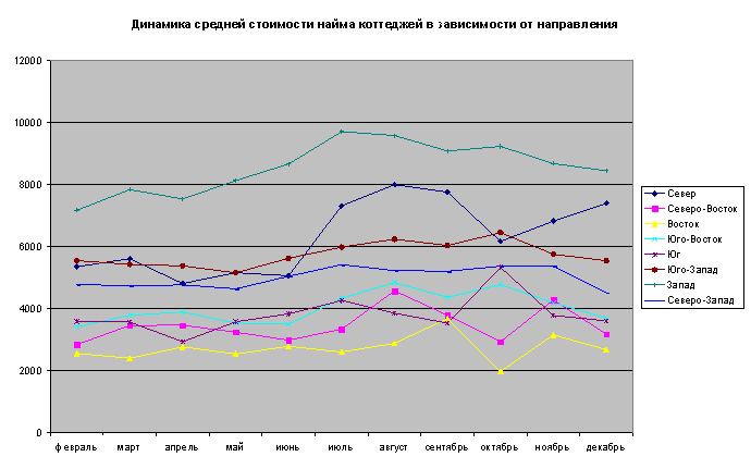 Наиболее дорогими направлениями на рынке аренды коттеджей являются Западное (Минское, Можайское, Рублево-Успенское, Новорижское, Ильинское шоссе), Юго-Западное (Калужское, Киевское, Боровское, Сколковское шоссе) и Северное (Дмитровское, Алтуфьевское, Осташковское шоссе). Наиболее дешевыми – Восточное (Горьковское и Носовихинское шоссе) и Северо-Восточное (Ярославское и Щелковское шоссе) направления.