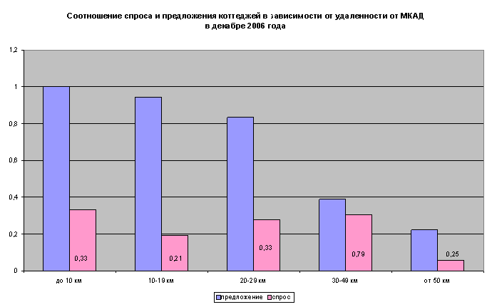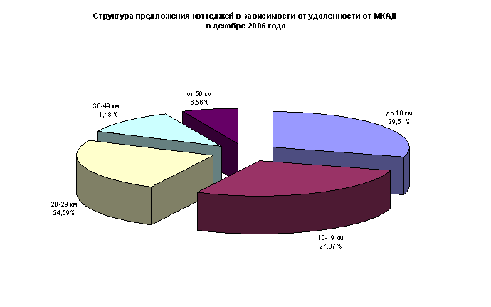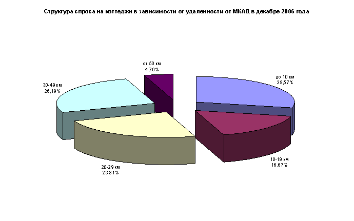Наибольшим спросом в декабре пользовались коттеджи, удаленные от МКАД не далее, чем на 10 км. (28,57%). Здесь же отмечен и самый большой объем предложения (29,51%).